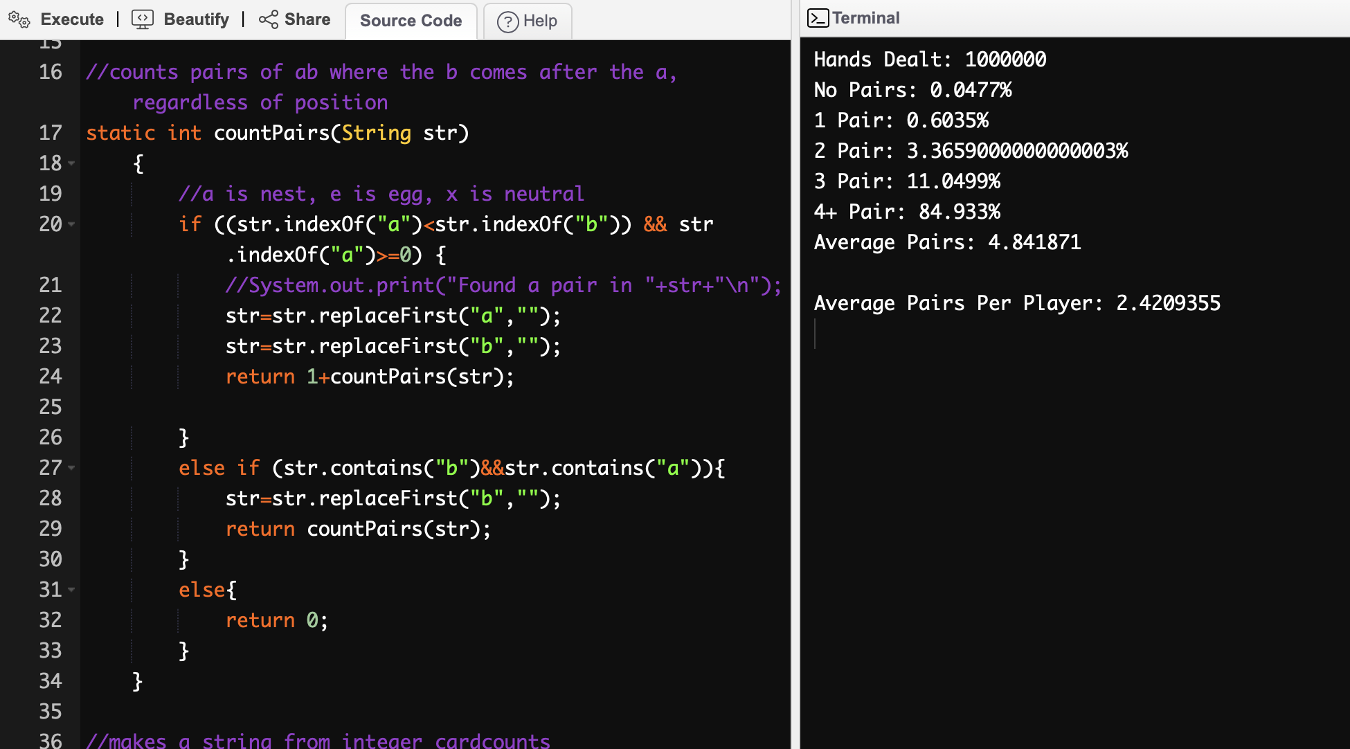 One particularly tricky part of the new addition: figuring out how many nests and eggs there should be. To do so, we needed to see what the expected value of pairs was for any given distribution of [Eggs] [Nests] [Cards with neither] in the deck.