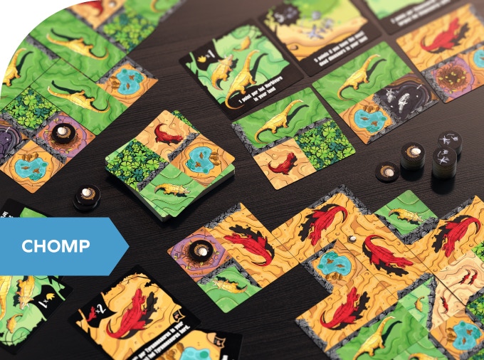 Chomp, designed by Clarence Simpson and published by Allplay, is a 2-4 player small box game filled with big dino fun. As you build out a land for your dinos, you'll also be building a puzzle-y chain of dino feeding and unique scoring goals.