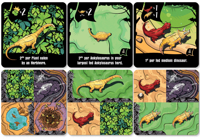 Each turn, you choose to take a point-scoring goal card or a card to grow your dino-inhabited land. Score points for feeding your dinosaurs and fulfilling your goal cards, but if carnivores can't feed on small animals at the watering holes, they'll chomp on your herbivores.