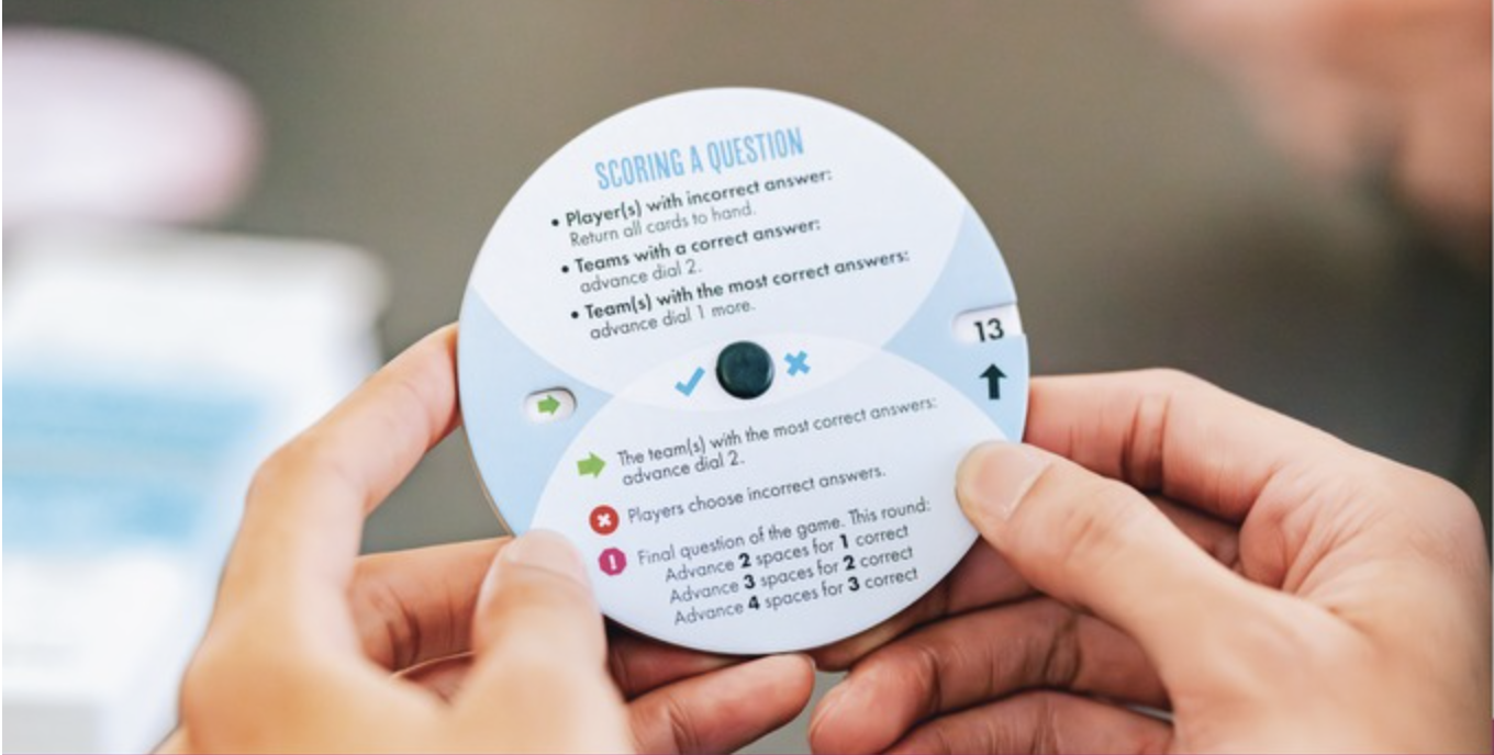 The original Half Truth uses a die as a randomizer to add some variety to the trivia rounds, which might change how you think about a question or how you want to bid. Once we were experimenting with dials we realized we could use dial position as a semi-random element.