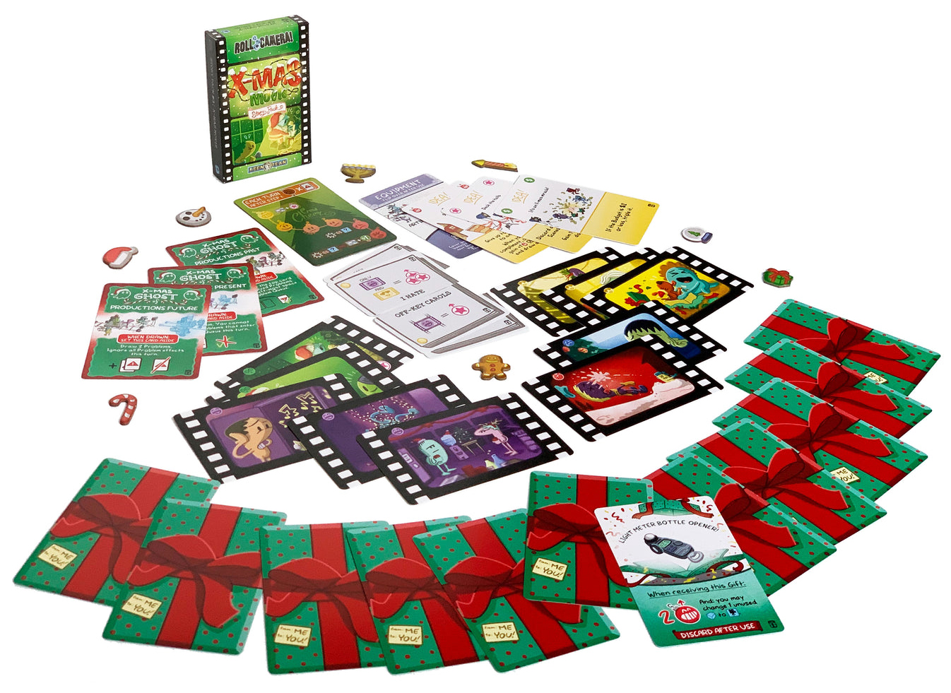 In the Murder Mystery Story Pack, players must carefully arrange specific dice on Set to rule out suspects for their movie's culprit. The X-mas Movie Story Pack has players managing a cheer tracker to monitor the holiday mood of their crew: let it fall too low and there will be grumpiness penalties, but giving each other gifts will keep spirits high and grant special one-time effects and ongoing bonuses.