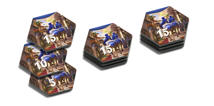 This expansion started as a concept from Knizia called Camel Markets, where several bonus camel tokens lined the edge of the board during setup. When a camel was placed on one of these tokens, you placed an additional camel matching the token's color.